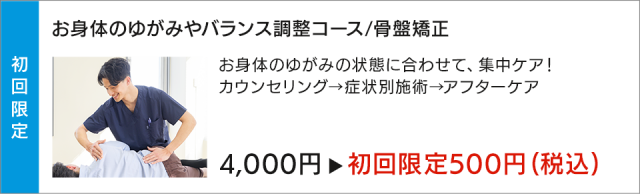 | お身体のゆがみやバランス調整コース/骨盤矯正 | 500円 | 4,000円 |